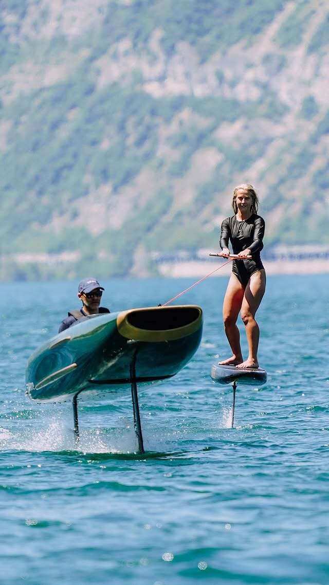Compared with e-foils, the control loop is different. A seated posture lowers the center of gravity; the long moment arm between front canard and rear main foil damps pitch changes at speed. For advanced users, the narrow hull allows precise line choice on turns, with stability coming from foil geometry rather than hull beam.